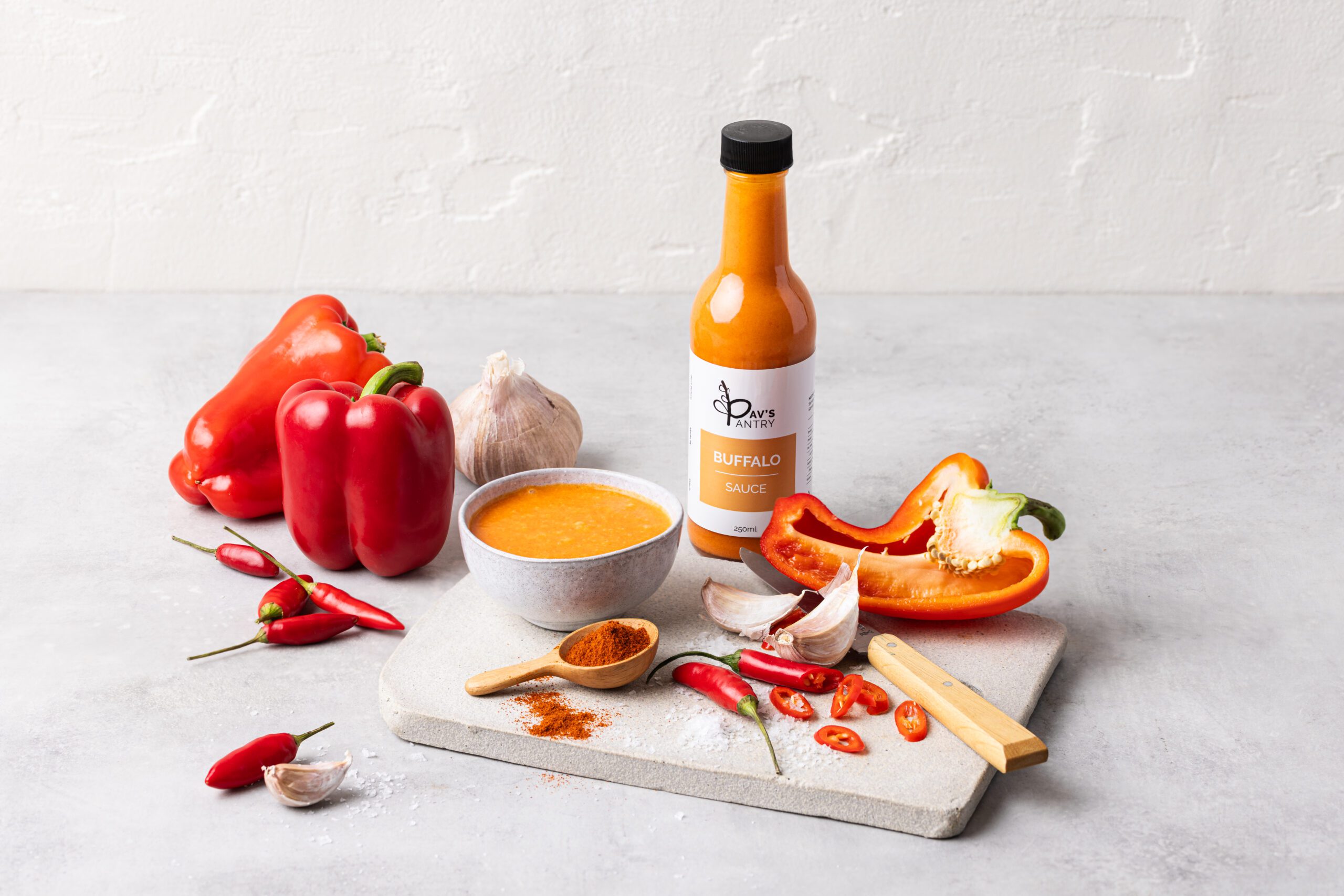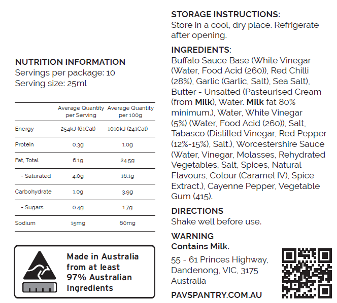 Buffalo Sauce Base (White Vinegar (Water, Food Acid (260)), Red Chilli (28%), Garlic (Garlic, Salt), Sea Salt), Butter – Unsalted (Pasteurised Cream (from Milk), Water. Milk fat 80% minimum.), Water, White Vinegar (5%) (Water, Food Acid (260)), Salt, Tabasco (Distilled Vinegar, Red Pepper (12%-15%), Salt.), Worcestershire Sauce (Water, Vinegar, Molasses, Rehydrated Vegetables, Salt, Spices, Natural Flavours, Colour (Caramel IV), Spice Extract.), Cayenne Pepper, Vegetable Gum (415).