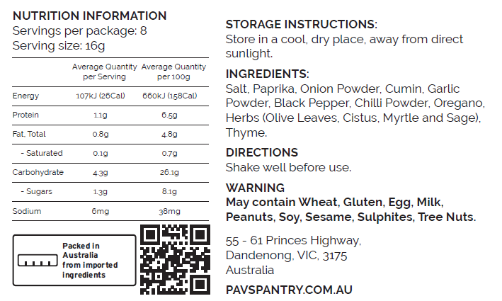 Salt, Paprika, Onion Powder, Cumin, Garlic, Pepper, Chilli Powder, Oregano, Herbs (Olive leaves, Cistus, Myrtle and Sage), Thyme