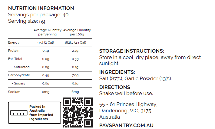 Why use just plain salt when you can add Pav’s Pantry Garlic Salt? Our Garlic Salt is a savory seasoning offering a deliciously aromatic flavour. Enhancing the taste of a wide variety of dishes, from meats and vegetables to pastas, pizzas, and roasted potatoes. Our Garlic Salt adds a burst of flavour without the need for fresh garlic. It’s a pantry essential for anyone looking to elevate the flavour profile of their cooking with ease.