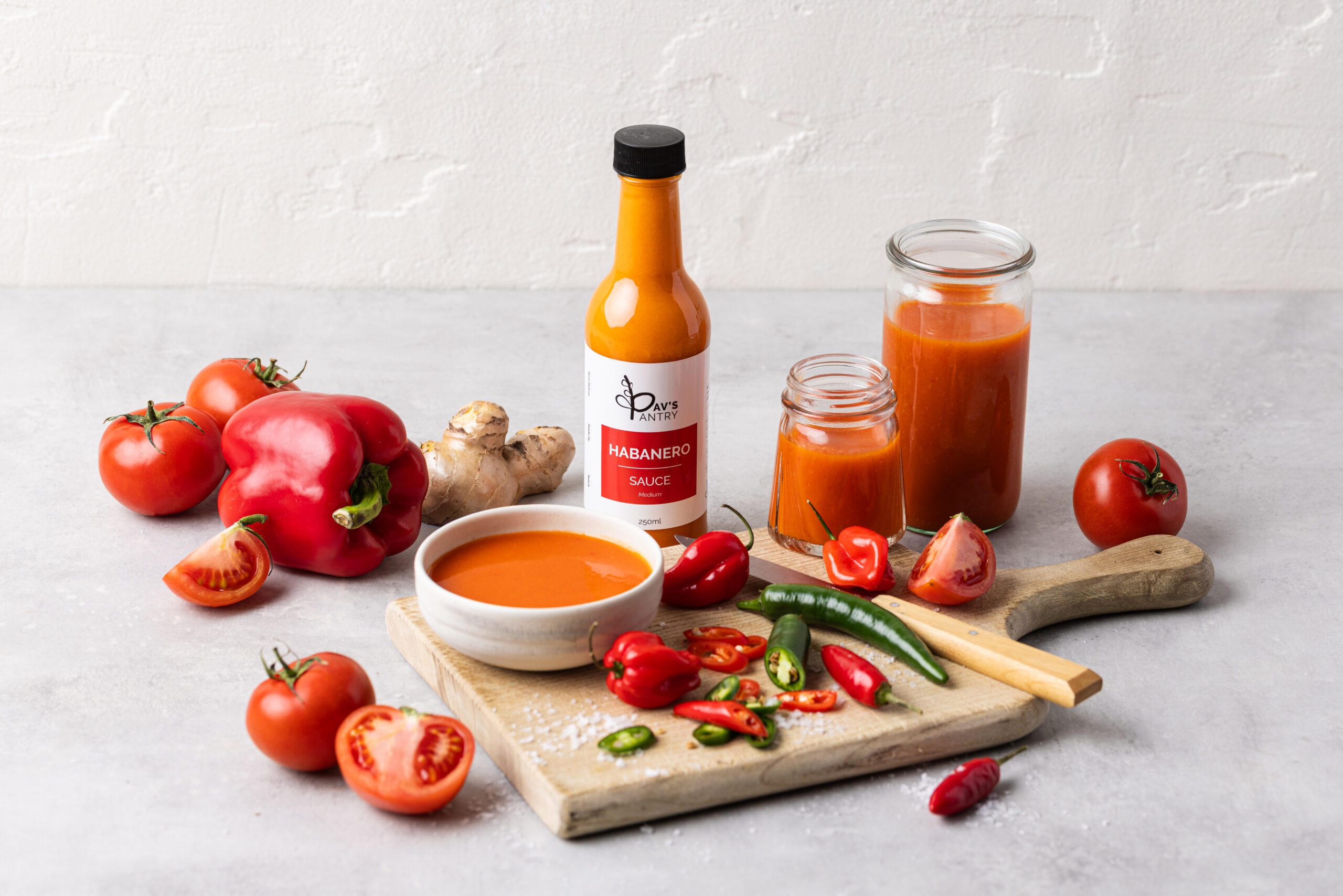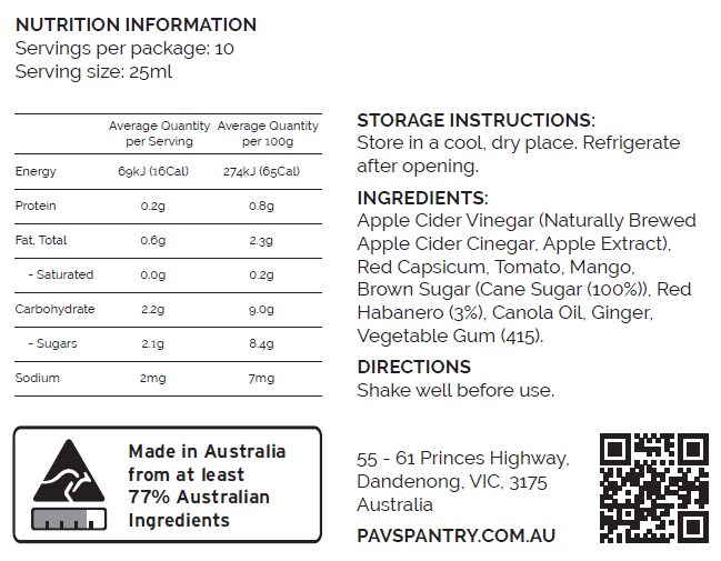 Apple Cider Vinegar (Naturally Brewed Apple Cider Vinegar, Apple extract), Red Capsicum, Tomato, Mango puree (Mango (75%)[Mango Puree, Food Acids (330, 300)], Water, Sugar, Vegetable Gum (415)), Brown Sugar (Cane Sugar (100%)), Red Habanero (3%), Canola Oil, Ginger, Xanthan gum.