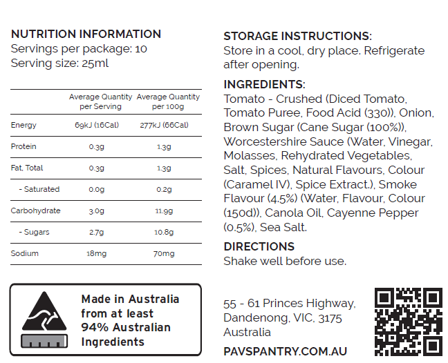 Tomato Crushed (Diced tomato, Tomato Puree, Food Acid (330)), Onion, Worcestershire Sauce (Water, Vinegar, Molasses, Rehydrated Vegetables, Salt, Spices, Natural Flavours, Colour (Caramel IV), Spice Extract), Brown Sugar (Cane Sugar), Smoke Flavour (4.5%)(Water, Flavour, Colour (150d)), Canola Oil, Cayenne Pepper (0.5%), Salt.